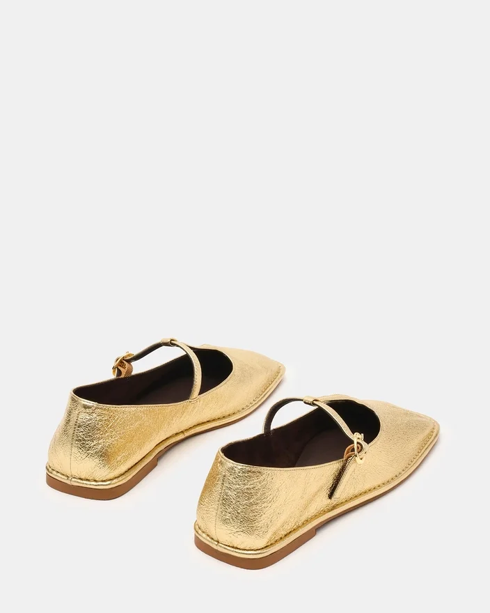 Macbeth Gold Leather kombinerer tidløs elegance med moderne design. Med en karakteristisk firkantet tå og raffinerede T-remdetaljer leverer denne model både sofistikering og komfort. Den flade balletkonstruktion giver et strømlinet profil, der er perfekt til overgangen fra dag til aften, mens den strukturerede tå og den støttende rem sikrer en sikker og elegant pasform.
