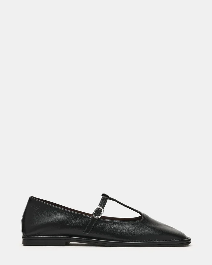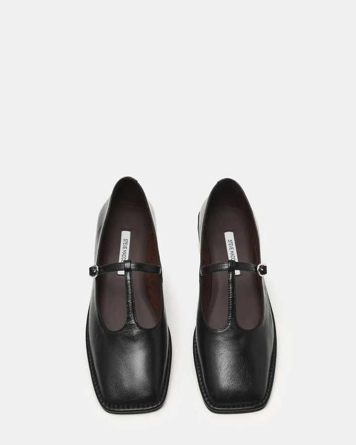 Macbeth sort læder kombinerer tidløs elegance med moderne design. Med en karakteristisk firkantet tå og raffineret T-remdetalje leverer denne model både sofistikering og komfort. Den flade konstruktion giver et strømlinet profil, der er perfekt til overgangen fra dag til aften, mens den strukturerede tå og den støttende rem sikrer en sikker og elegant pasform. Et uundværligt supplement til enhver kræsne garderobe.