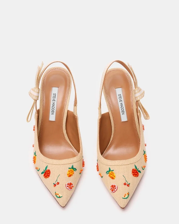 Et grosgrainbånd vikles rundt om slingback-remmen på Bri Raffia Fruit Multi spids tå stiletto-pumps og afsluttes med en sløjfe, der fremhæver siden af skoen.