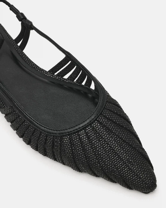 Alandria Black Raffia er en sofistikeret flad sko med spids tå, der kombinerer tidløs elegance med moderne komfort. Den vævede konstruktion giver en åndbar struktur, mens Slingbacks-designet tilbyder sikker støtte. Perfekt til overgangen fra kontoret til aftenen. Denne alsidige stil passer nemt til kjoler, bukser eller Casual-tøj. Et raffineret must-have til den kræsne garderobe.