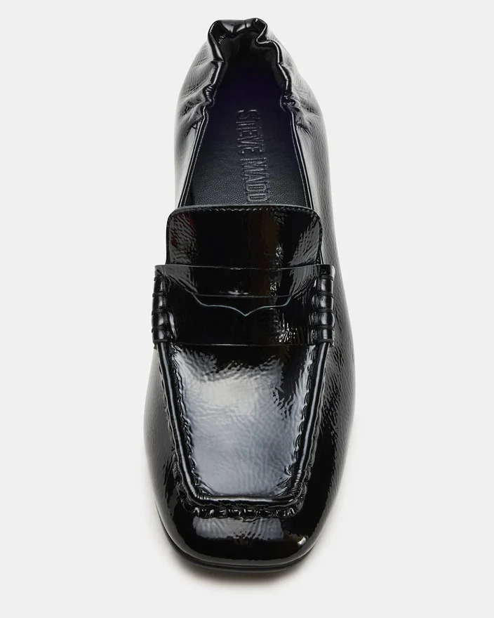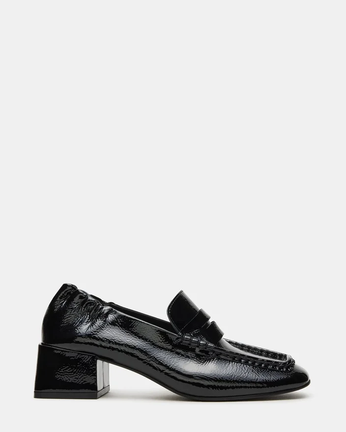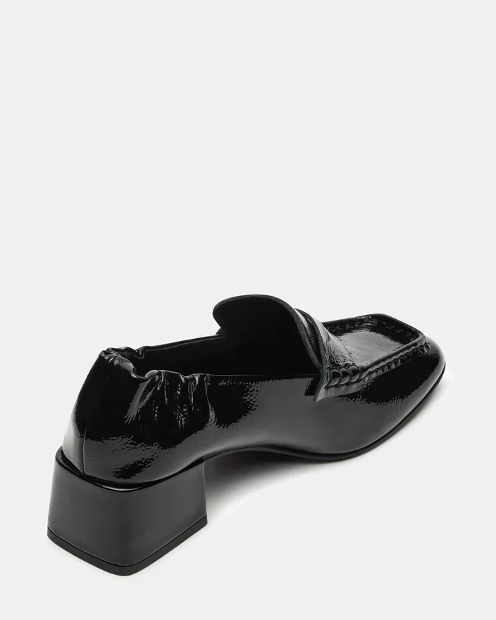Estee sort krøllet lak-Loafer har et raffineret design med firkantet tå og hæl, der kombinerer moderne stil med ekspert håndværk. Den krøllede lakfinish tilføjer en subtil tekstur, mens den strukturerede hæl giver både elegance og støtte. Denne Loafer er ideel til professionelle, der søger en sofistikeret, men alligevel behagelig sko, der fremhæver ethvert outfit med et moderne touch.