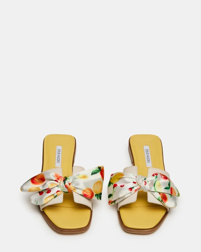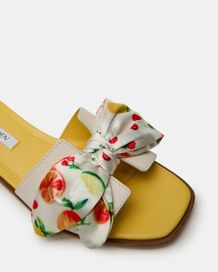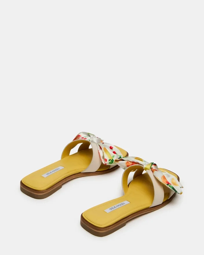 Geometriske udskæringer på den brede, enkelte rem på Hadyn Citrus Multi Scarf Slide giver dette flade sandaldesign et friskt look.
