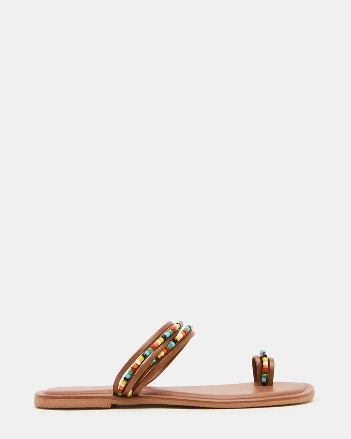 Nabila Tan Multi-sandaler har et karakteristisk design med firkantet tå, der suppleres af en række flerfarvede perler, hvilket giver et raffineret og kunstnerisk touch til din sommerfodtøjskollektion. De omhyggeligt udformede detaljer fremhæver både stil og komfort, hvilket gør den til et ideelt valg for dem, der værdsætter ekspert håndværk kombineret med livlig flair.