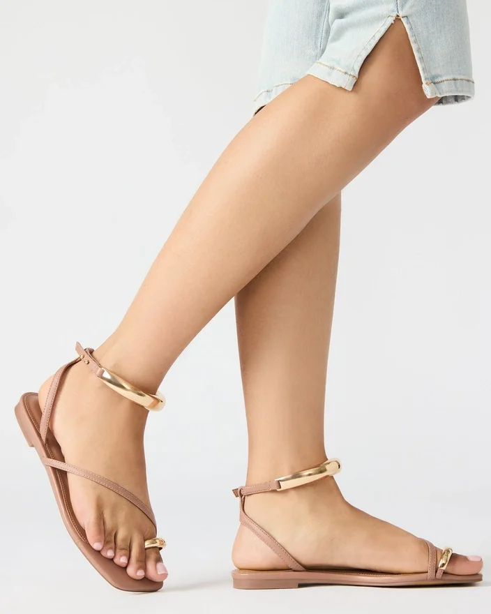 Odyssey-sandaler tilbyder både stil og komfort med sit remdesign, firkantede tåform og ankelrem med guldbeslag. En elegant tåring tilføjer et strejf af sofistikering. Perfekt til en dag ude eller en aften i byen.