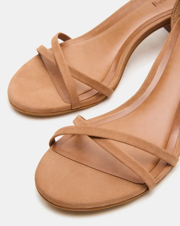 Rae Tan Nubuck-sandaler med remme og højhælede blokhæle kombinerer moderne stil med pålidelig komfort. Den er fremstillet af kvalitetsmaterialer og har smalle remme, der giver sikker støtte, samtidig med at de fremhæver fodens naturlige form. Den robuste blokhæl sikrer stabilitet og komfort, hvilket gør den ideel til både dag- og aftenbegivenheder, hvor du ønsker at se elegant ud uden at gå på kompromis med komforten.