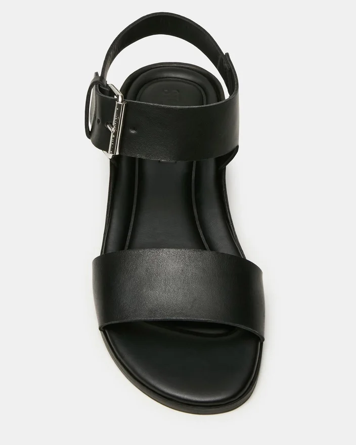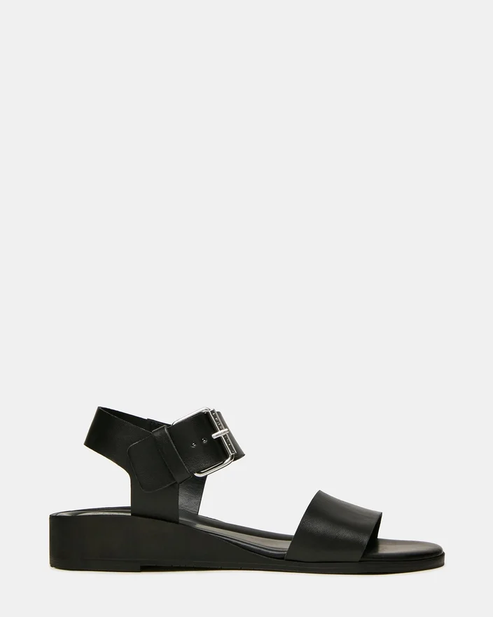 Vaeda Black Leather Kilehæle Sandal kombinerer stil med hverdagsbrug. En justerbar rem med spænde sikrer en tilpasset pasform, mens kilehælen giver pålidelig støtte og en diskret forhøjning. Uanset om du skal til brunch eller ud at ordne ærinder, tilpasser denne sandal sig din livsstil med diskret raffinement og komfort hele dagen.