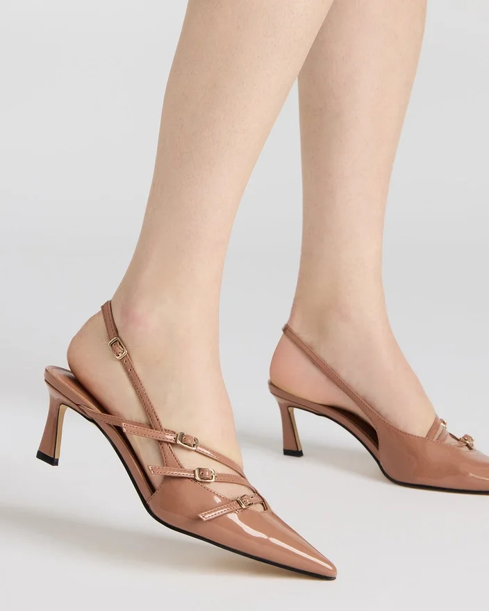 Forkæl dig selv med luksus med Liana Slingback. Med sin lave hæl og spidse tå udstråler denne sko elegance. Designet med remme foran tilføjer et strejf af sofistikering, mens det lakerede materiale løfter det samlede look.