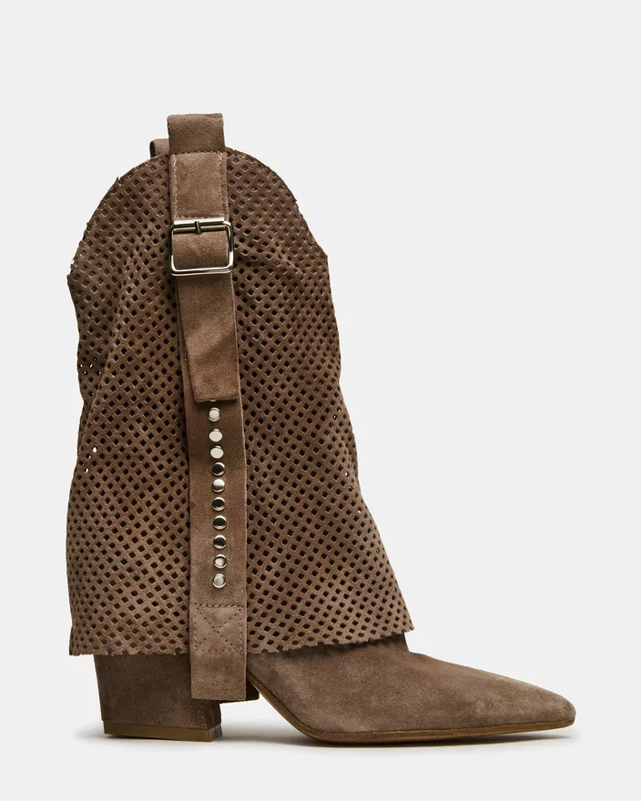 Aubrielle Taupe Suede-støvlen leverer western-inspireret raffinement med en slående spids tå og en dramatisk foldet manchet. Nitter langs skaftet tilføjer et kantet, modebevidst element, der løfter den traditionelle æstetik. Det strukturerede design balancerer dristig styling med bærbar elegance, hvilket gør den til et ideelt valg for dem, der søger en moderne fortolkning af klassisk Western-fodtøj. Perfekt til begivenheder, hvor du vil gøre indtryk, eller til hverdagsbrug, der kræver opmærksomhed.