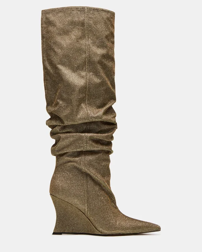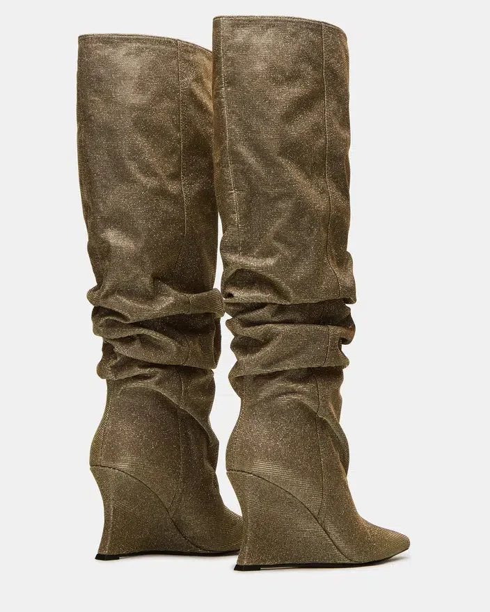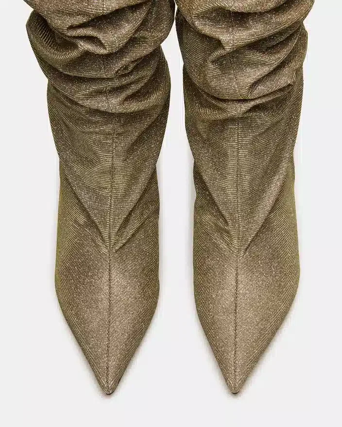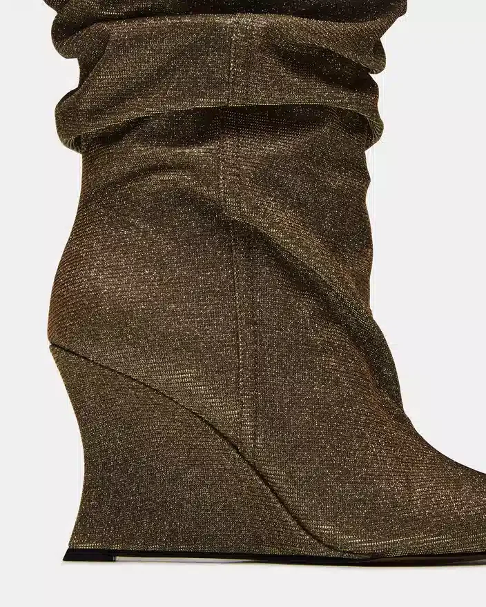 Distortion Gold Glitter-støvlen har et krøllet design, kilehæl og spids tå, der går op til knæhøjde for en dristig, modebevidst silhuet. Denne støvle er skabt til at kombinere kantet stil med komfortabel pasform og løfter ethvert outfit med sit slanke design og karakteristiske kilehæl. Ideel til dem, der søger et statement-stykke, der balancerer trend og praktisk anvendelighed.