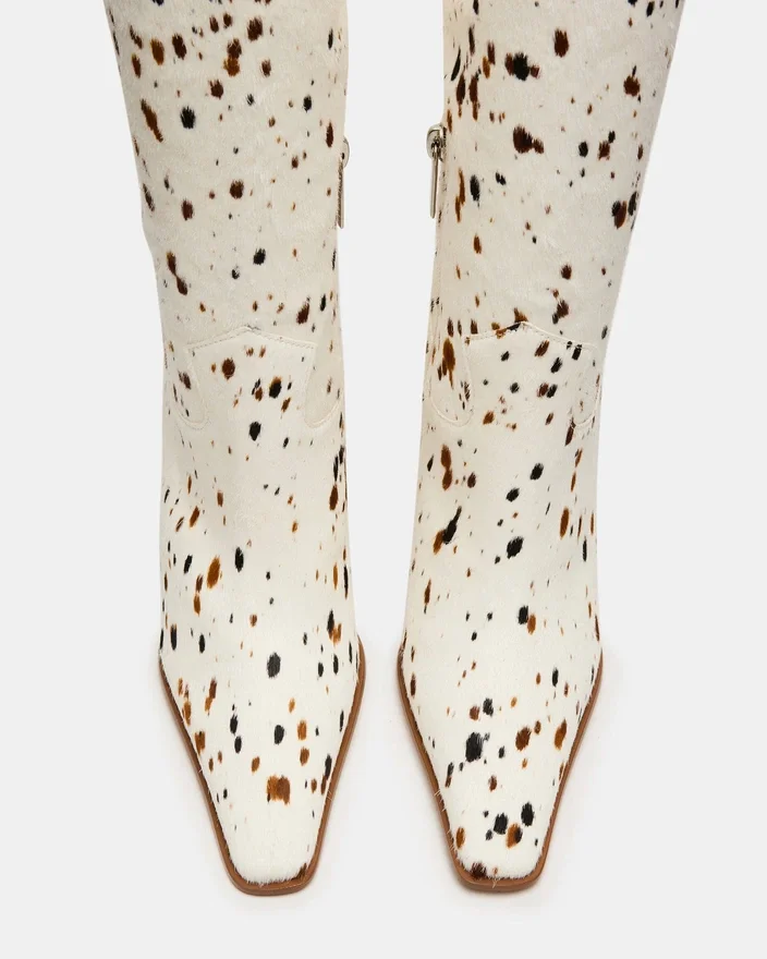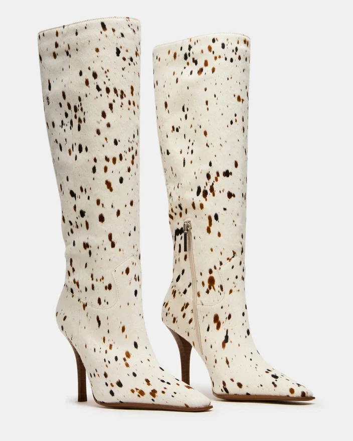 Løft din skosamling med Wescot Brown Cow Print knæhøje støvler, der har en moderne firkantet tå og en raffineret hæl. Disse støvler er fremstillet af kvalitetsmaterialer og tilbyder både stil og struktur, perfekt til sofistikerede looks, der kræver komfort og selvtillid.