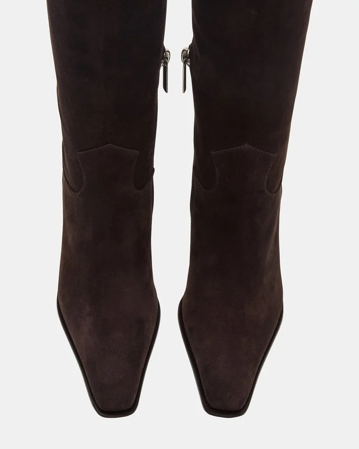 Løft din skosamling med Wescot-knæhøje støvler i brunt ruskind, der har en moderne firkantet tå og en raffineret hæl. Disse støvler er fremstillet af kvalitetsmaterialer og tilbyder både stil og struktur, hvilket gør dem perfekte til sofistikerede looks, der kræver komfort og selvtillid.
