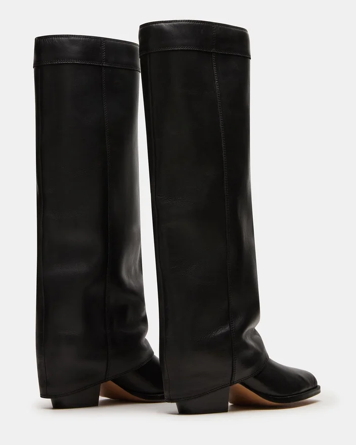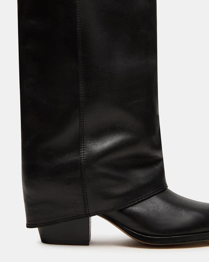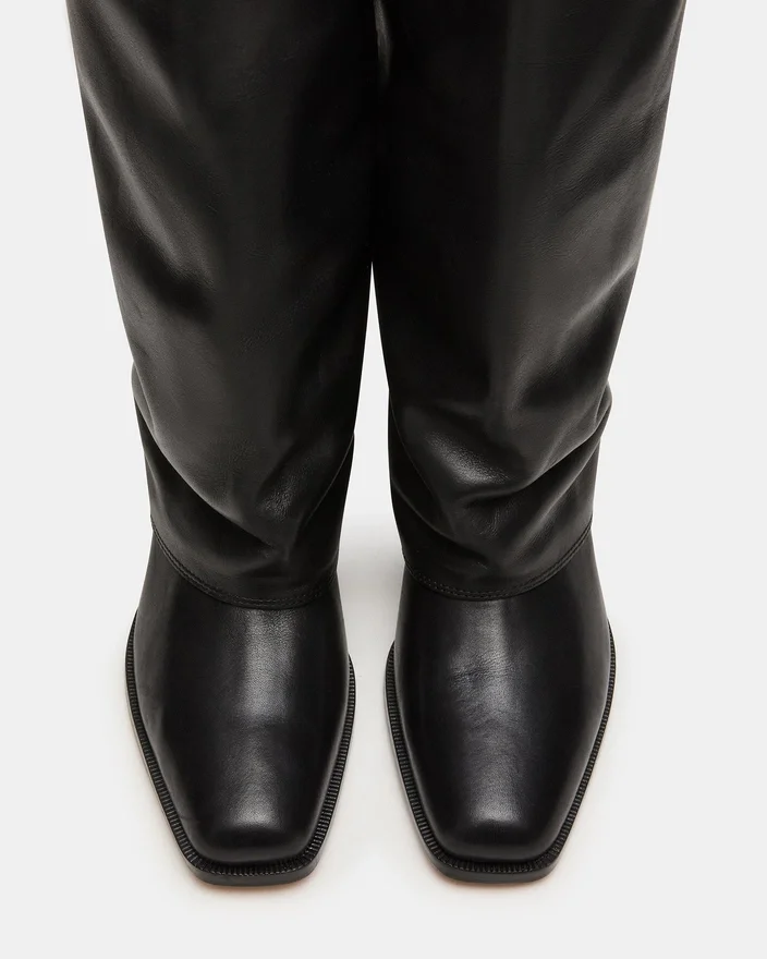 Løft din skosamling med Winnick-støvlen i sort læder, der har et sofistikeret design med opsmøg, der går op til knæet for et markant look. Denne støvle er udformet med en moderne firkantet tå og understøttet af en robust blokhæl, hvilket kombinerer stil med stabilitet og gør den ideel til brug hele dagen.
