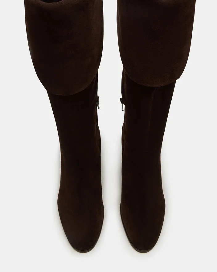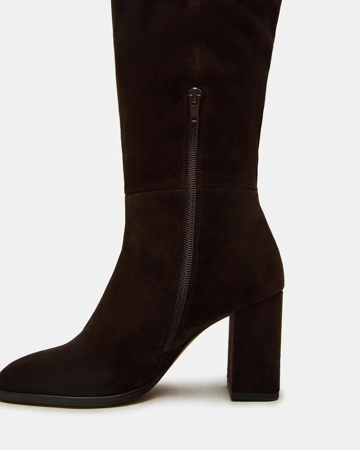 Winslet-støvlen i brunt ruskind har en knæhøj silhuet med en solid blokhæl, der sikrer både stil og stabilitet. Den afrundede tå sikrer komfort ved langvarig brug, hvilket gør den til et alsidigt valg, der løfter din garderobe med et raffineret, professionelt touch. Denne støvle forener tidløs elegance med praktisk funktionalitet.