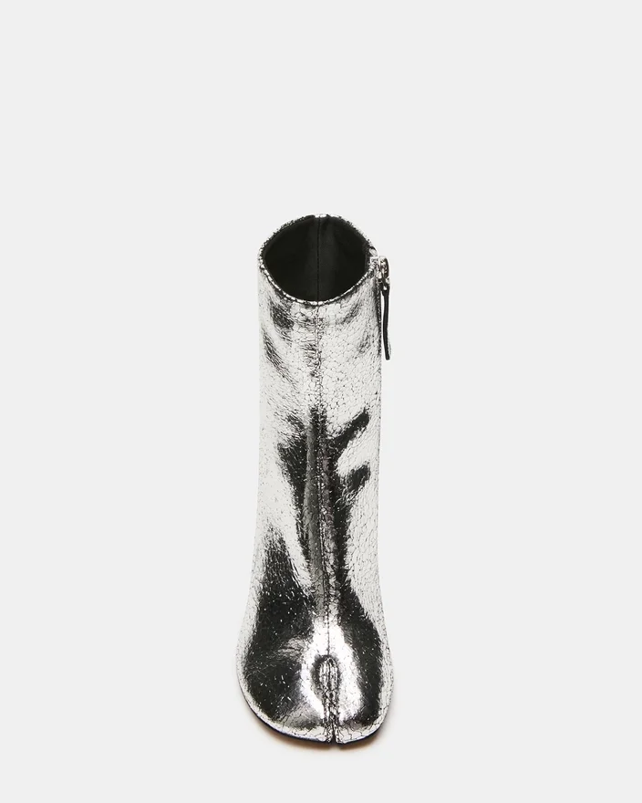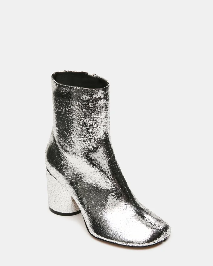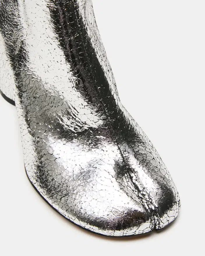 Caro Silver Crinkle har den karakteristiske Tabi-silhuet med delt tå, der tilbyder en moderne æstetik med funktionel komfort. En robust blokhæl giver stabil støtte hele dagen, samtidig med at den bevarer et slankt profil. Denne ankelstøvle kombinerer problemfrit forfinet stil med alsidighed til hverdagsbrug.