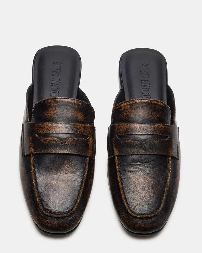 Caleb er en stilfuld flad mule med slip-on-design for ekstra komfort. Det distressed design tilføjer et strejf af karakter til ethvert outfit. Fagligt fremstillet til langvarig brug.