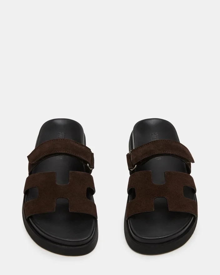 Mayven chokoladebrune ruskindssandaler har komfortable konstruktionsdetaljer som en formstøbt fodseng, en flad sål med mønster og en justerbar toprem samt en forreste rem med geometrisk udskæringsdesign.25 tommer hælhøjde