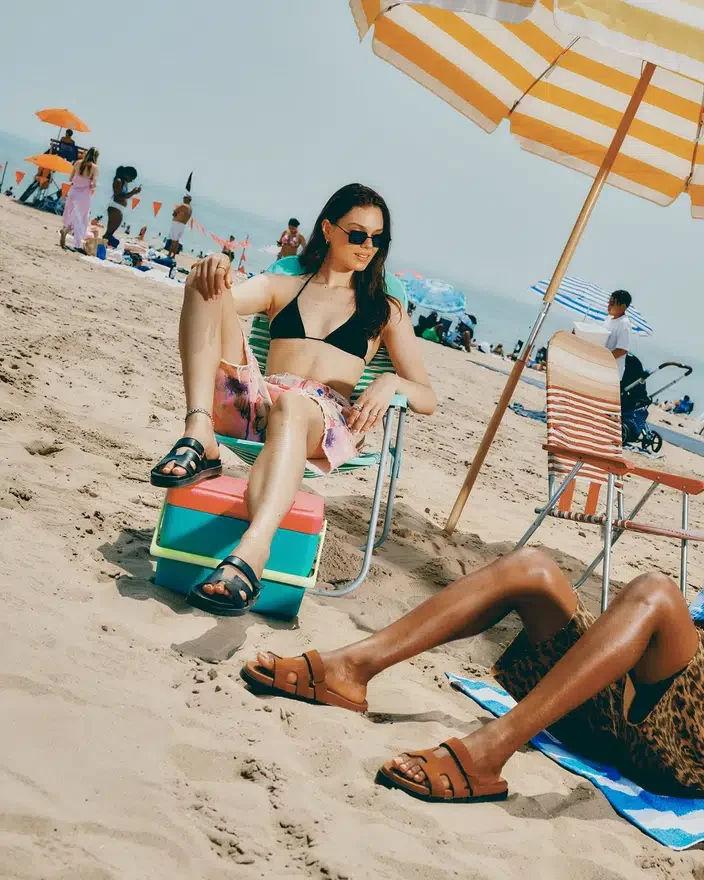 Mayven-sandaler har komfortable konstruktionsdetaljer som en formstøbt fodseng, en flad sål med mønster og en justerbar rem øverst samt en rem foran med geometrisk udskæring.