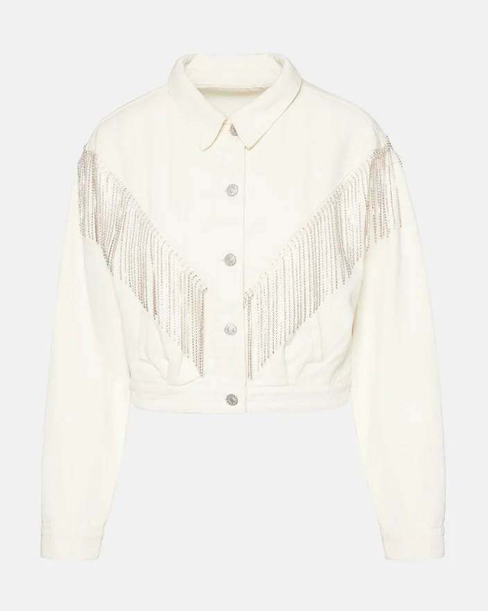 Canyon Denim Jacket er fremstillet af eksperter og er et must-have i enhver garderobe. Denne korte denimjakke har udsøgte frynser med rhinestones, der giver et strejf af Western-glamour, mens knaplukningen sikrer en perfekt pasform.