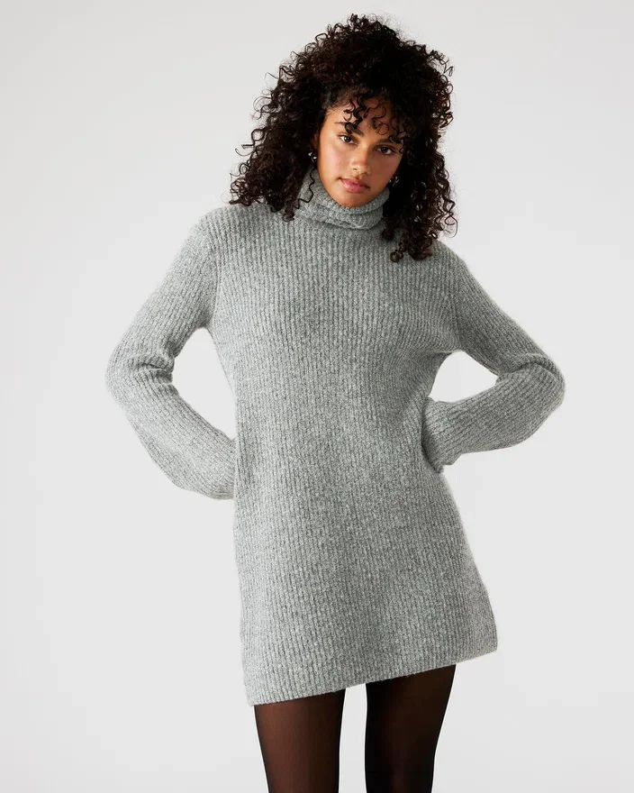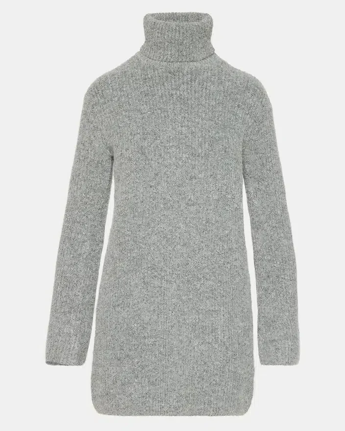 Abbie-sweaterkjolen er mesterligt udformet med rullekrave og udsvungne ærmer og tilbyder en afslappet, men stilfuld pasform. Det bløde, børstede materiale giver varme og komfort, hvilket gør den til den perfekte minikjole til køligere vejr. Løft din garderobe med denne alsidige og smarte pulloverkjole.