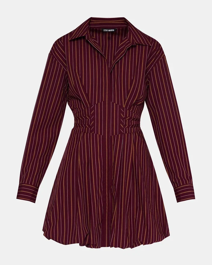 Arielle-kjolen er en raffineret version af den klassiske langærmede kjole med knapper. Den skræddersyede pasform og den dybe vinrøde farve skaber en sofistikeret silhuet, der er ideel til professionelle omgivelser eller elegante lejligheder.