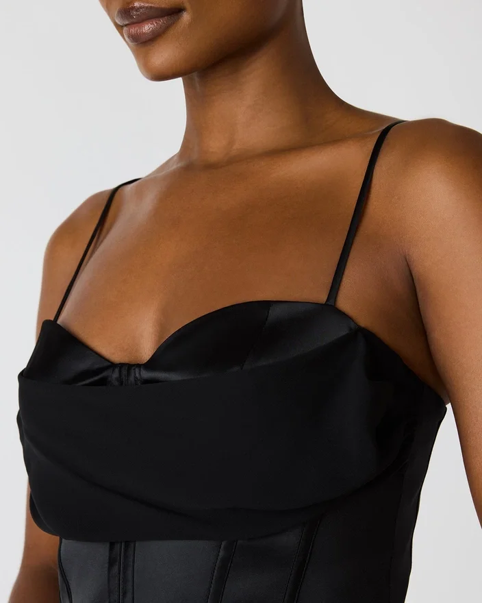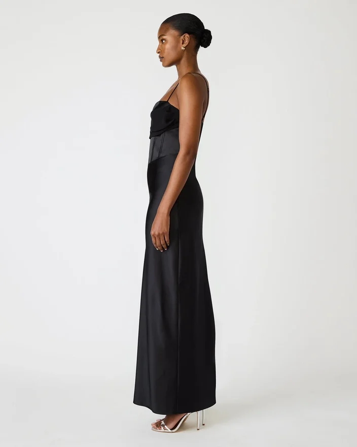 Carmela-kjolen i sort kombinerer tidløs elegance med moderne raffinement. Denne maxi-kjole er fremstillet af luksuriøst satinstof og har et struktureret bustier-overdel, der giver flatterende støtte og form. Justerbare stropper giver mulighed for en tilpasset pasform, mens den praktiske lynlås i ryggen sikrer nem påklædning.