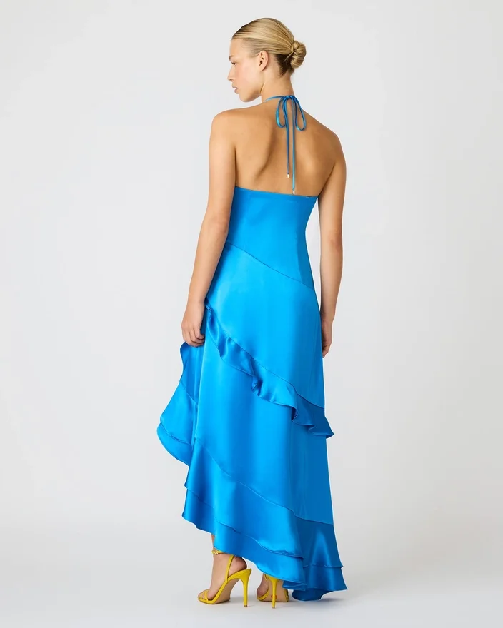 Caspia-kjolen i blå har en sofistikeret silhuet med høj halsudskæring og flagrende maxi-længde. Dette iøjnefaldende stykke fremviser et asymmetrisk design, der fremhæves af flæser, der tilføjer bevægelse og dimension. En praktisk lynlåslukning i siden sikrer en nem pasform, samtidig med at kjolens elegante linjer bevares. Perfekt til at gøre et modigt indtryk ved enhver lejlighed.