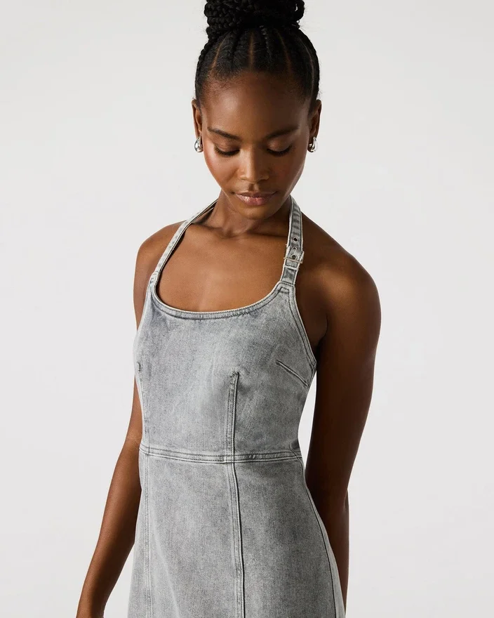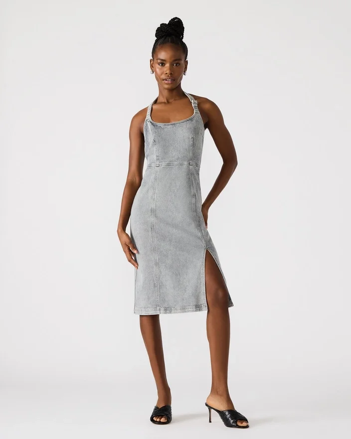 Gia-denimkjolen er fremstillet med ekspertise og er et must-have i enhver garderobe. Slidsen i siden tilføjer et strejf af sofistikering, mens lynlåsen bagpå sikrer en perfekt pasform. Denne kjole er fremstillet af materialer af høj kvalitet og er både stilfuld og holdbar. Perfekt til enhver lejlighed.