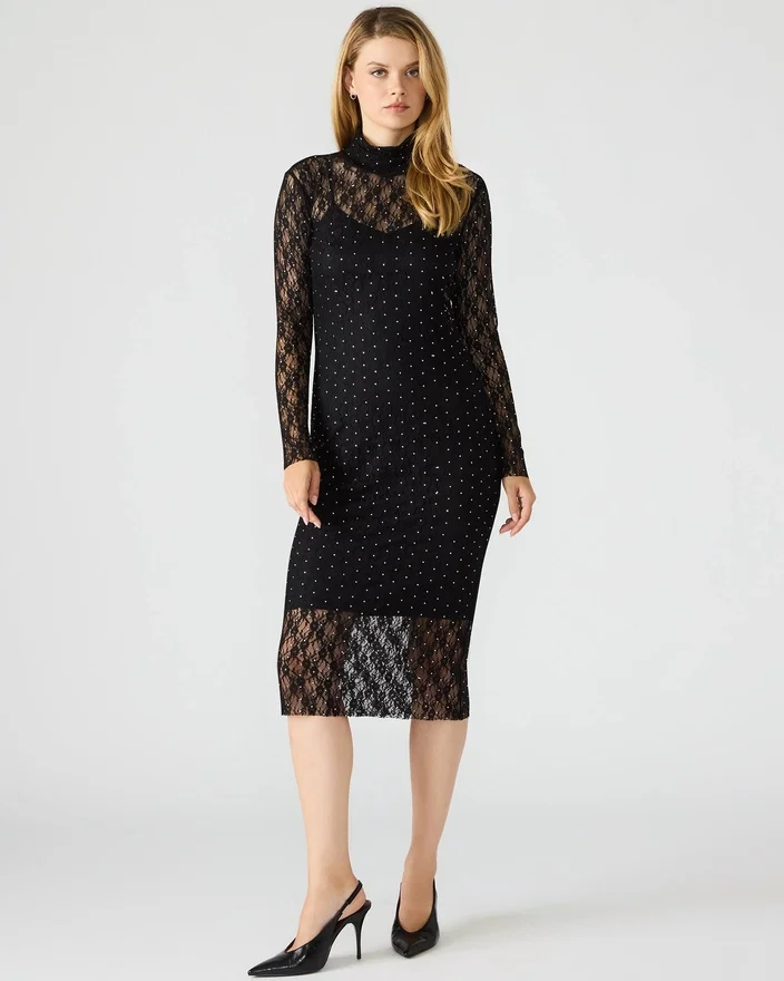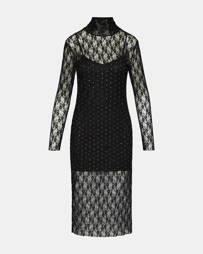 Vivienne-blonderkjole med nitter i sort har et foret yderlag i gennemsigtigt mesh i midi-længde, afsluttet med en høj hals og ærmer med tommelfingerhuller.