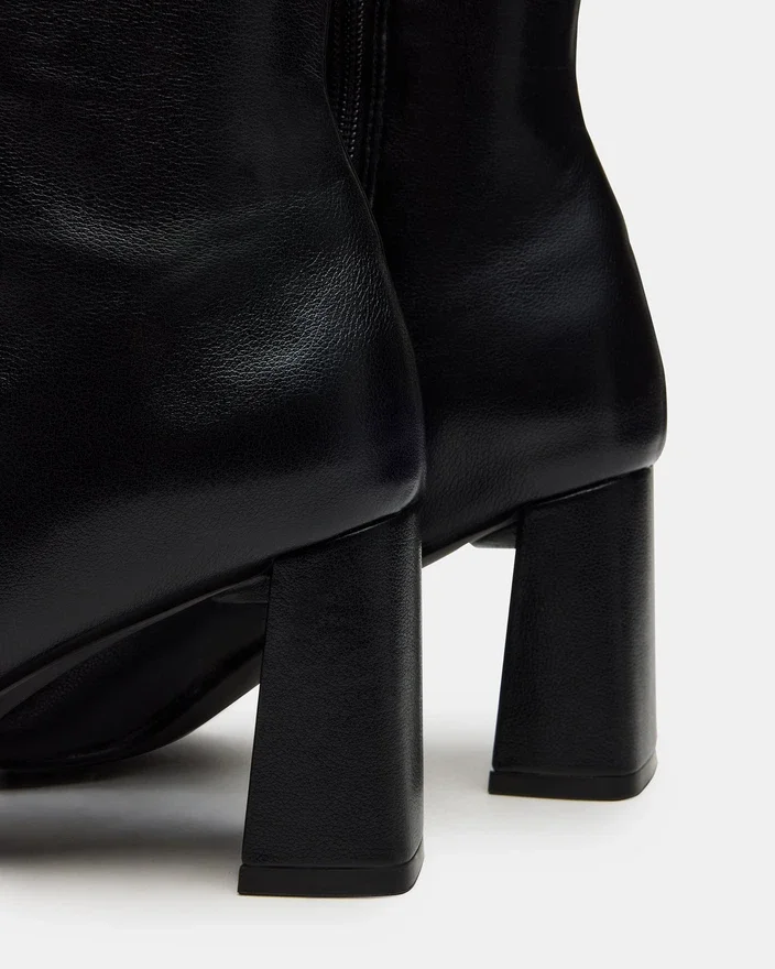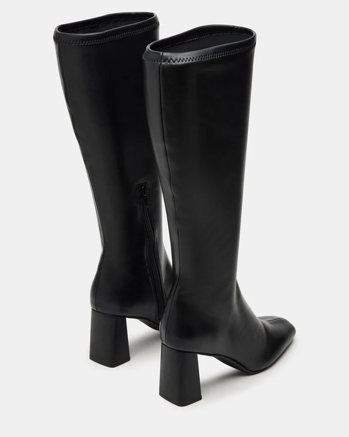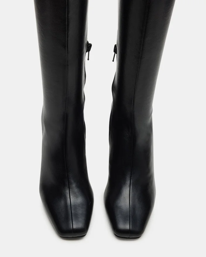 En halv lynlåslukning giver Holly Black Wide Calf knæstøvlen en pasform, der fremhæver læggen, mens en vinklet blokhæl og en firkantet tå giver denne model et skarpt finish.
