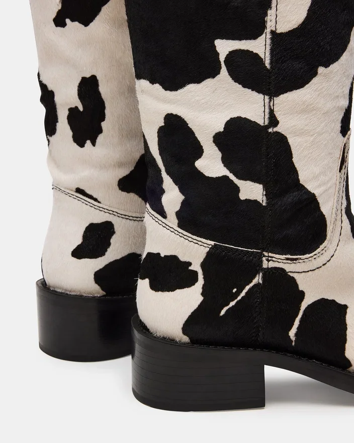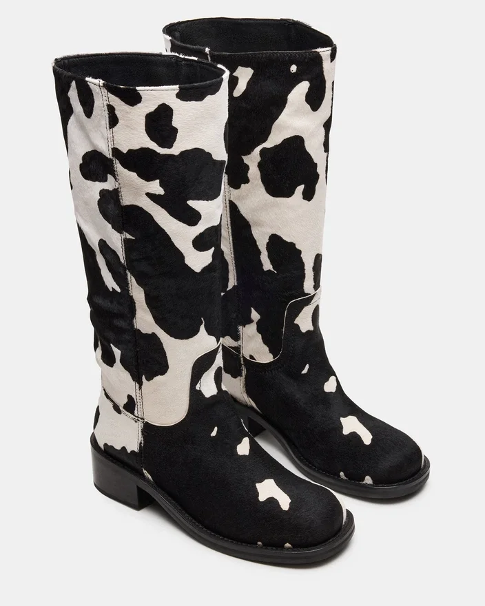 Løft din stil uden besvær med Riggs Black Cow Print Støvlen med bredt skaft. Med sin firkantede tå og slanke design er denne støvle, der går lige under knæet, et must-have for enhver modebevidst person. Denne tidløse støvle tilbyder både komfort og raffinement, hvilket gør den til det perfekte supplement til ethvert outfit.
