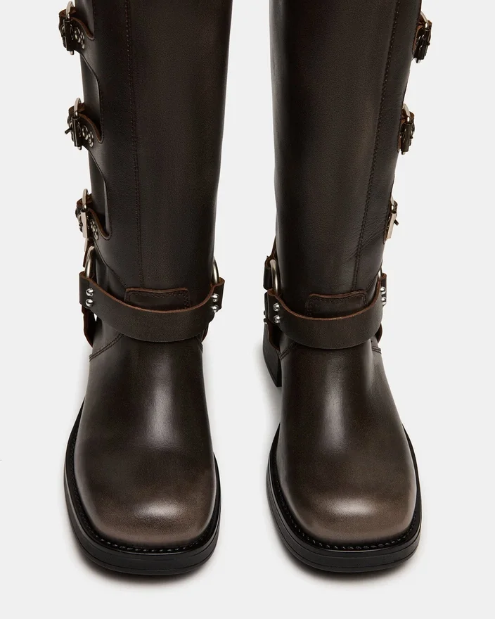 Rocky Brown Distressed Wide Calf Knee Støvl har den brede pasform, der kendetegner en ingeniørstøvle, med remme og spænder, der tilfører et industrielt look og giver designet en justerbar pasform.
