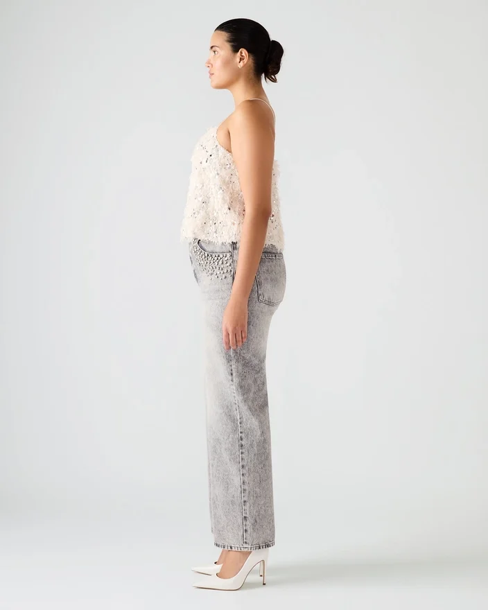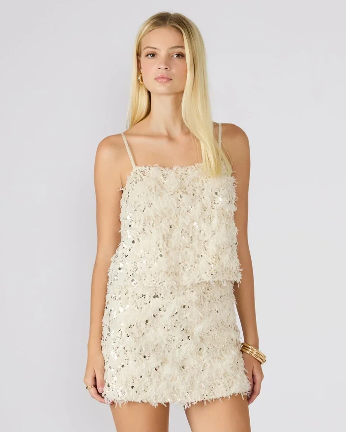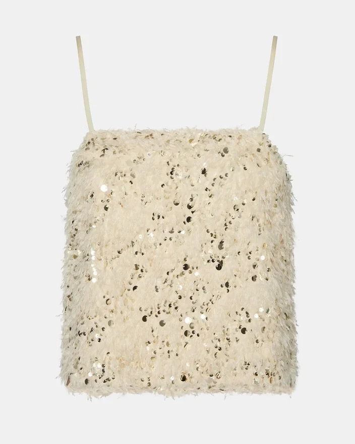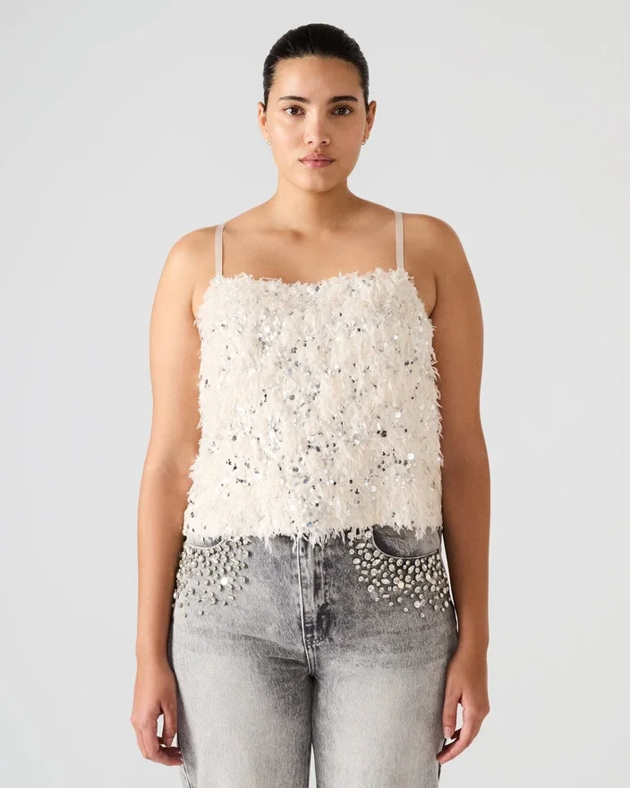 Løft dit outfit med Blakelyn Feather Top Ivory, en ærmeløs top med delikate fjer-detaljer og skinnende pailletter. Denne top er perfekt designet som en del af et matchende sæt og tilføjer tekstur og diskret glans, hvilket gør den ideel til sofistikerede lejligheder eller stilfuld aftengarderobe.