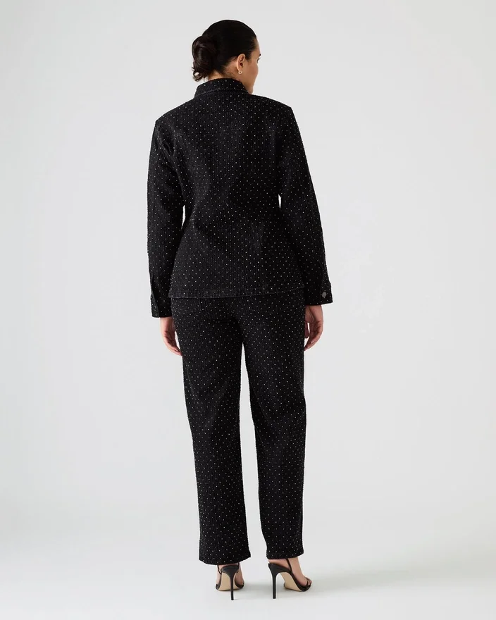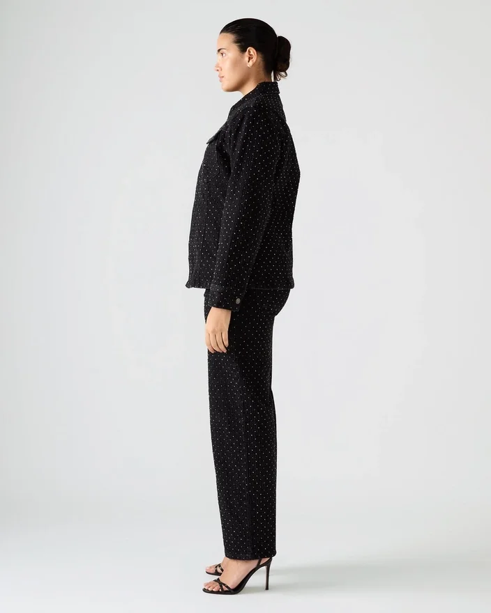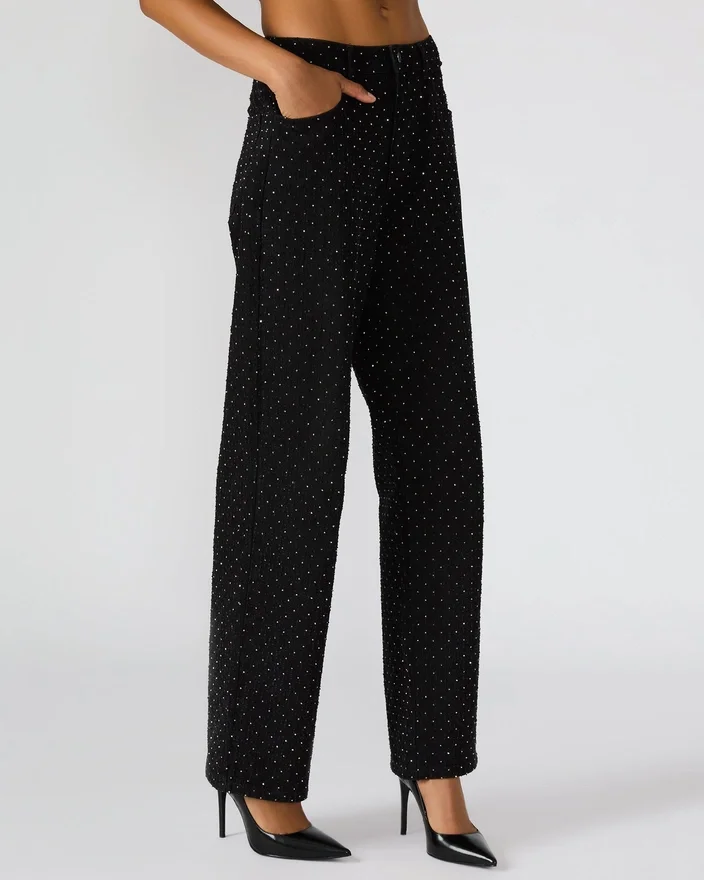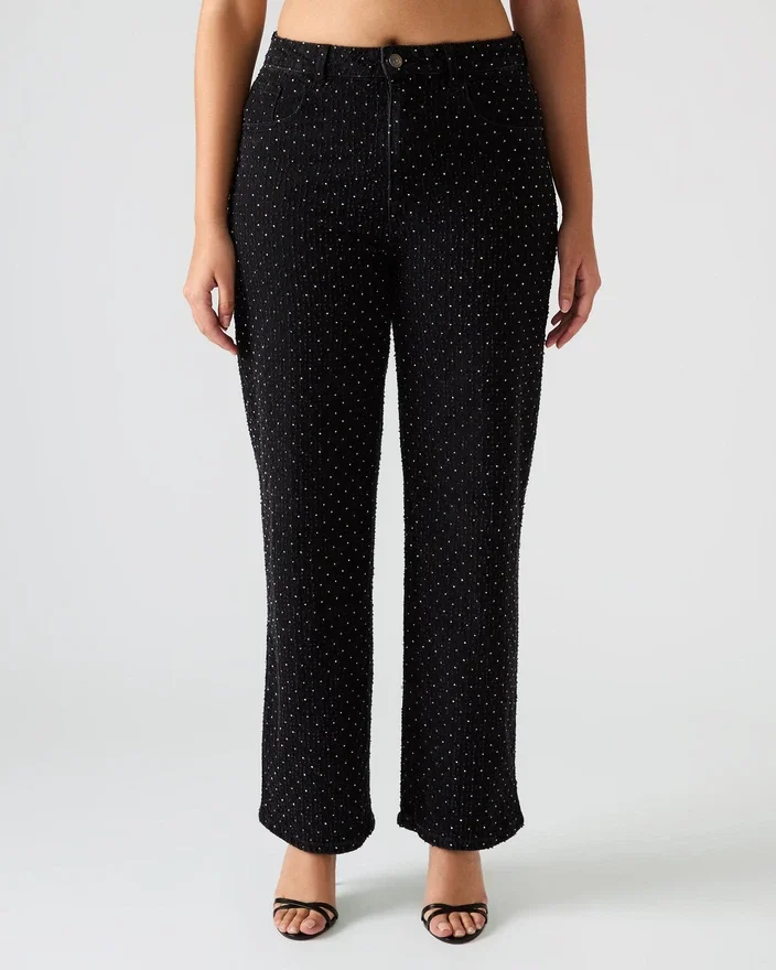 Disse Avaline Crystal Jean Black straight-leg denimjeans har en elegant vask, der er forstærket med omhyggeligt placerede rhinestone-pynt, hvilket tilføjer en raffineret glans til din garderobe. De er designet med praktiske lommer foran og bagpå og kombinerer modebevidst stil med hverdagsfunktionalitet. Perfekte til at løfte Casual looks med et strejf af sofistikering.