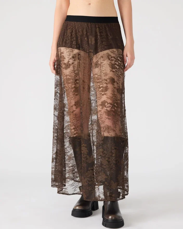 Giv din garderobe et løft med Gisela-nederdelen, en maxi-lang, gennemsigtig blonder-nederdel, der kombinerer elegance med moderne raffinement.