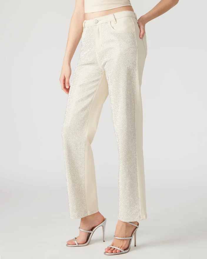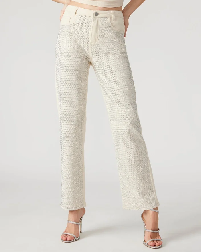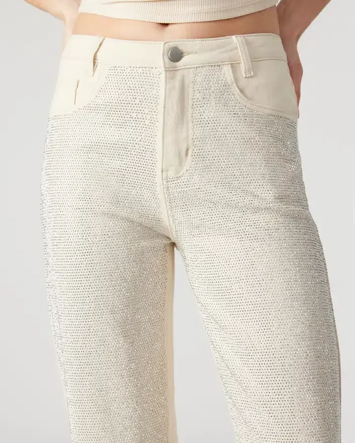Jesse Jeans er de perfekte jeans med lige ben og pynt, prydet med smukke rhinestones foran. Løft din stil med disse unikke og iøjnefaldende bukser, der er perfekte til at gøre et statement.