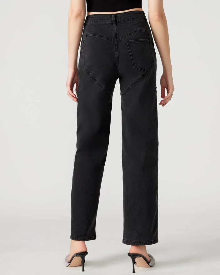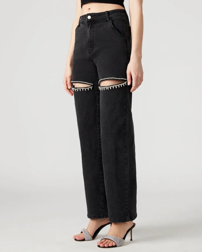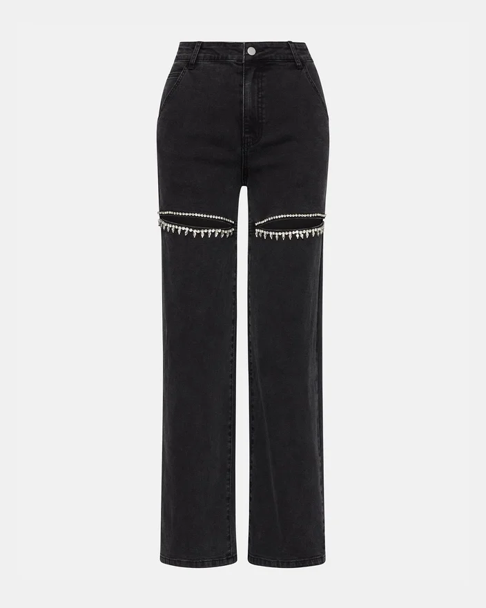 Taylor-jeansene giver et stilfuldt twist på et klassisk design. Med deres brede ben tilbyder disse jeans komfort og alsidighed, mens de intrikate udskæringer med rhinestones på lårene tilføjer et strejf af glamour.