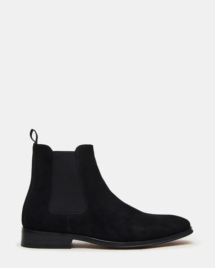 Aldair Black Suede Chelsea-støvlen kombinerer tidløst design med ekspert håndværk. Med en elegant finish og elastiske sidepaneler tilbyder den både stil og nem pasform. Den slidstærke sål sikrer pålideligt greb, hvilket gør den til et alsidigt valg til både Casual og formelle lejligheder. Løft din skosamling med denne ekspertfremstillede støvle, der balancerer komfort og raffinement.
