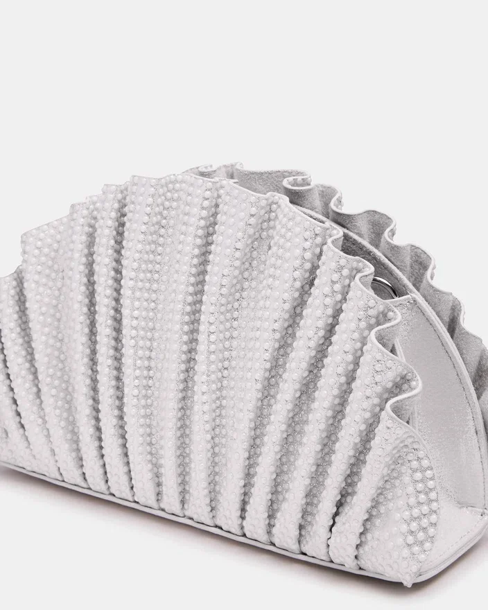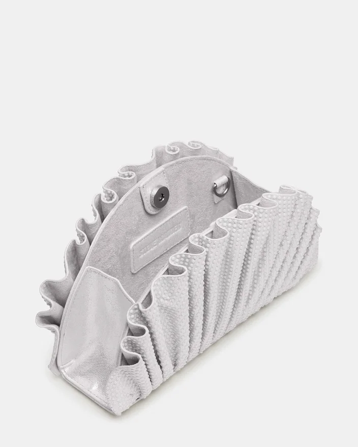 Delmar-tasker i hvid løfter den daglige elegance med sin skulpturelle, flæset halvcirkelformede silhuet. Denne clutch er fremstillet af skinnende imiteret ruskind og balancerer kunstnerisk design med praktisk funktionalitet. Den magnetiske snaplukning sikrer sikker lukning, mens den aftagelige kæderem kan tilpasses fra håndholdt til håndfri brug. Et indvendigt kortlomme holder det væsentlige organiseret. Fuldt udsmykkede detaljer tilføjer visuelt interesse uden at gå på kompromis med bærbarheden, hvilket gør dette stykke til et sofistikeret Accessory til enhver lejlighed.