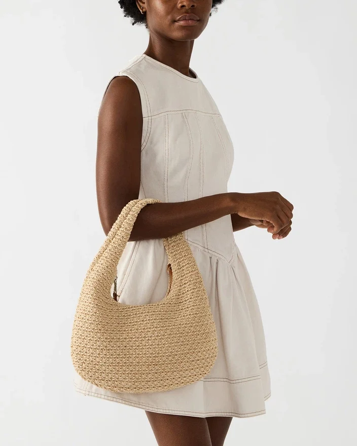 Oplev luftig mode med Daena-tasken i naturfarve. Denne halvmåneformede håndtaske er fremstillet af naturligt strå og har en praktisk lynlåslukning øverst samt er pyntet med et kvadratisk tørklæde med knuder og print.