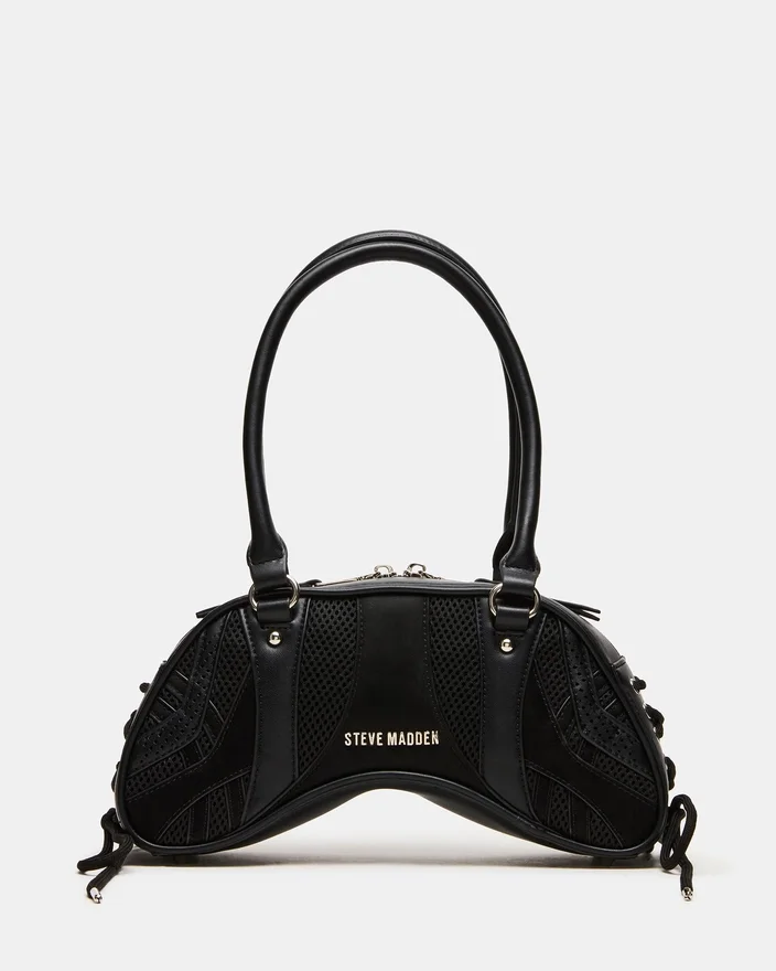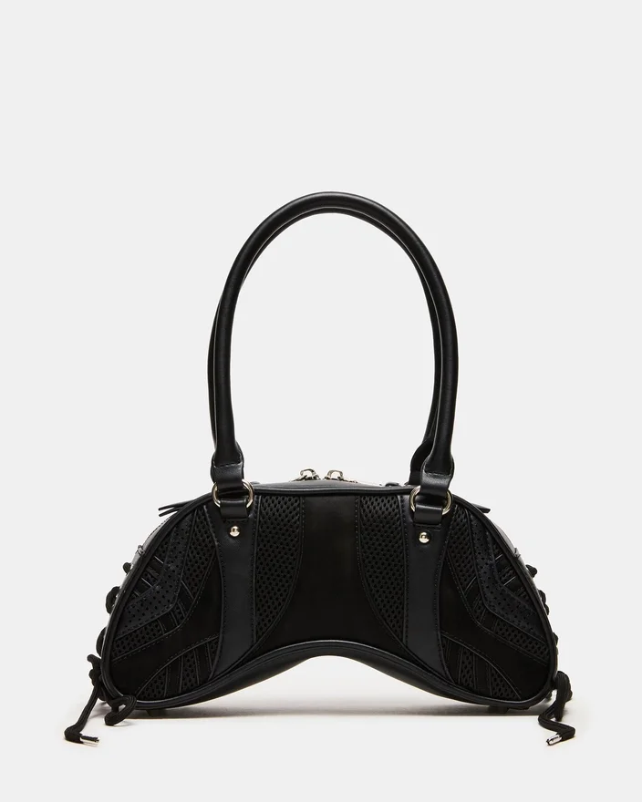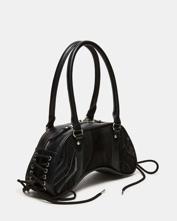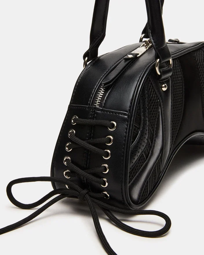 Løft din tilbehørskollektion med Kody-tasken i sort. Denne sofistikerede skuldertaske har praktiske rørformede stropper og karakteristisk snøring med øjer langs siderne, der giver tasken et interessant udtryk. Spændedetaljen foran tilføjer et strejf af kantet raffinement, mens den sikre lynlåslukning øverst sikrer, at dine nødvendigheder forbliver beskyttet. Alsidig nok til både dag- og aftenbrug.